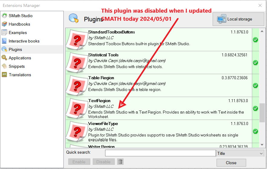 I think the text plugin is actually packaged with SMath. Note the plugin version number matches the SMath version. I'd just leave it. It just provides some basic text functions.