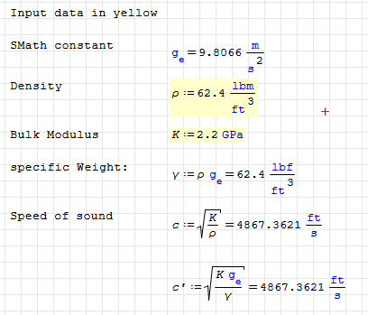 As I know, the speed of the sound into a fluid is sqrt(K/rho)=14.9245 ft/sec, for your data and where K is the fluid bulk modulus and rho the fluid density. With your rho, in lbm/ft^3, this is the fluid density. You need g only if you have the specific weight gamma = rho/g. I know that a lot of books use rho for both: density and specific weight, and it's very confusing that notation.