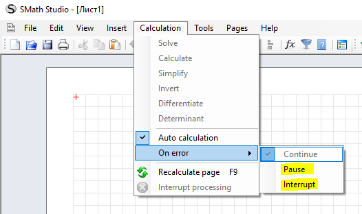 - Added ability to specify behavior on calculation error occurs: Continue (default), Pause or Interrupt;