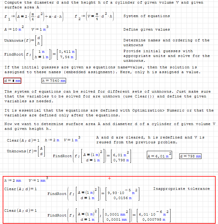 In the first example with volume and height being close to unity in base units, the default tolerance is appropriate.