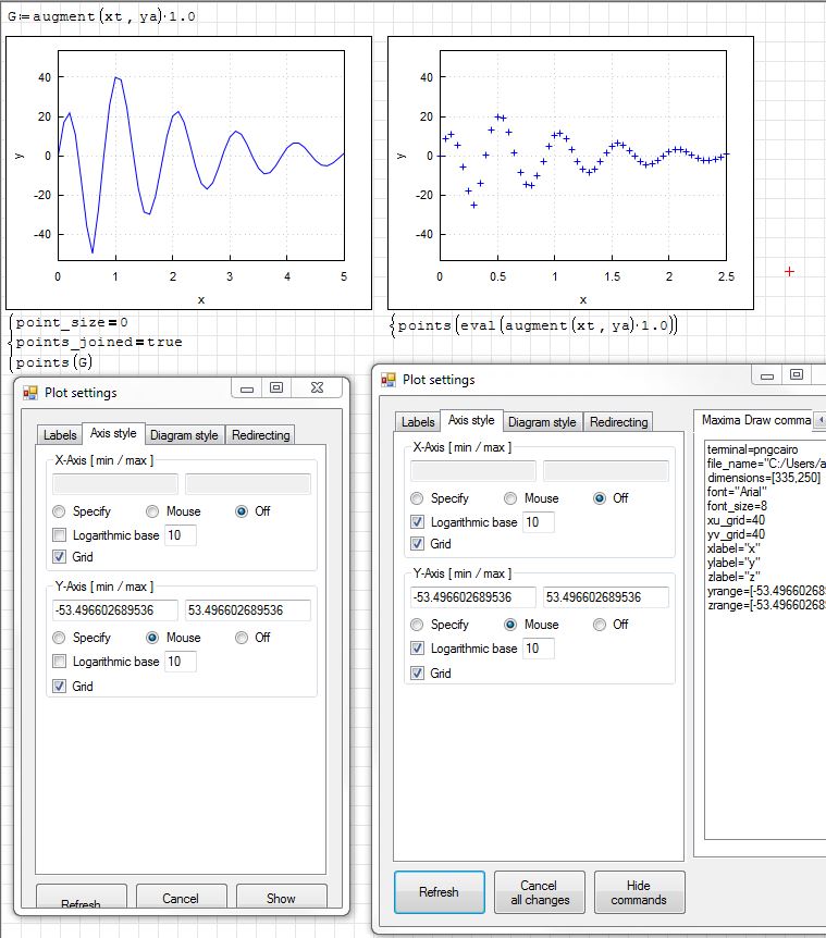 I am trying to plot XY-scatter points that are saved in matrix-form. I can do this in the native SMath plot feature and the XY-Plot plugin, but can't seem to recreate this in the Maxima plugin...I get drawing errors.
