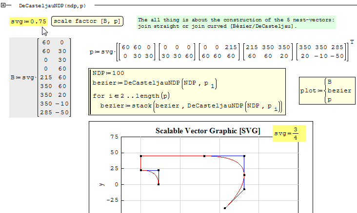 SMath Forum SMath Studio Samples DeCasteljau-Bezier 1 Pages (1 items) DeCasteljau-Bezier - DeCasteljau-Bezier - Messages Go to last post #1 Posted: 9/12/2017 8:22:51 AM Jean Giraud 983 likes in 6,866 posts. Group: User Revisit this superb piece of Smath application.De Casteljau SVG MCD-.sm (16.73 KiB) downloaded 774 time(s). 1 Pages (1 items) New Posts No New Posts