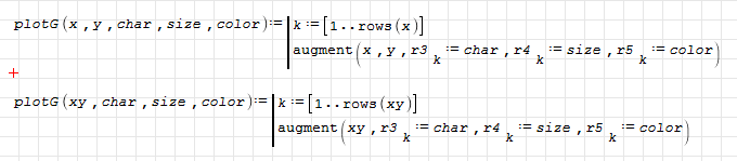 plotG(x,y,char,size,color):line(k:range(1,rows(x)),augment(x,y,el(r3,k):char,el(r4,k):size,el(r5,k):color),2,1)plotG(xy,char,size,color):line(k:range(1,rows(xy)),augment(xy,el(r3,k):char,el(r4,k):size,el(r5,k):color),2,1)