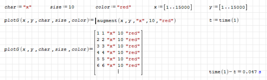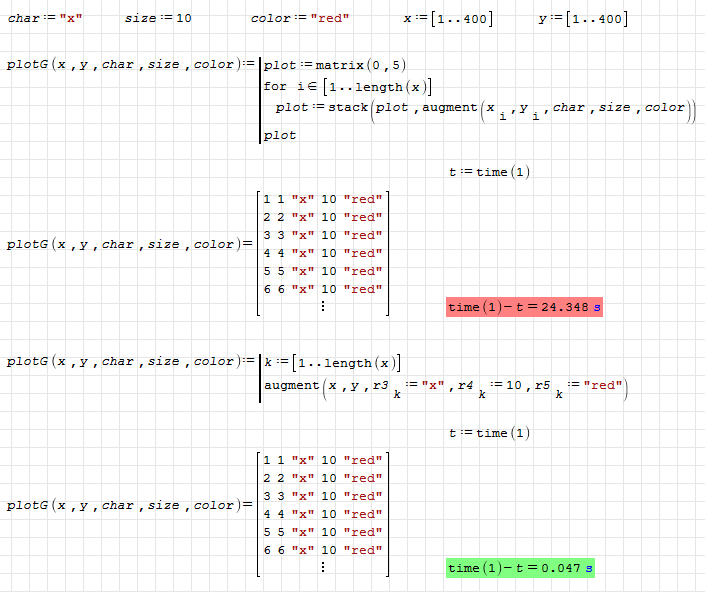 Note, that I had to make height of the result matrix about 40 times larger to see the same time! This means that this syntax of stack/augment is about 40 times faster then without it.