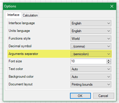 please check in your program settings (Tools > Options) what is the character assigned to arguments separator