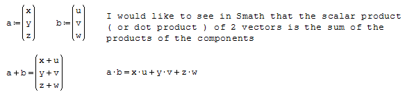 As already stated I don't want with my calculations to come up with a number but I would like to see in Smath that the scalar product ( or dot product ) of 2 vectors is the sum of the products of the components on each axis i.e that what should comes up from the symbolic calculations of the product is what is highlighted in yellow herewith :