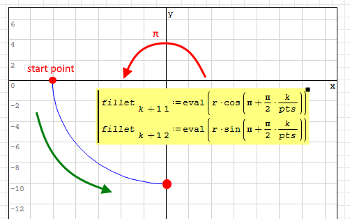k/pts*pi/2 is the angle at each loop, and increments from 0 to pi/2 as k increments from 0 to pts - You can add pi to the angles above to have the arc with the correct order of points and the right orientation (remember that we are drawing the RHS of the shape)