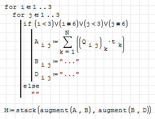 You have to define A,B,D in a loop, then you can merge the matrices using augment(...) and stack(...)
