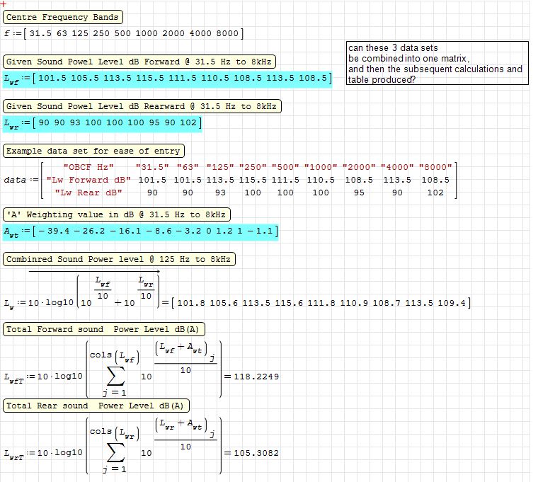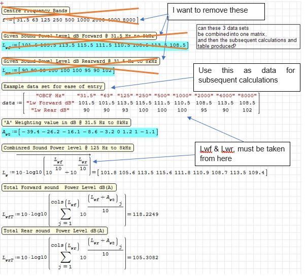 I have a worksheet that I am trying to simplify for the data input, what I would like to do is combine all the relevant input data into one matrix, but avoiding the use of augment or stack functions, so effectively using the single data matrix as shown below, its the extraction of each row or column data to do the various calculations in an easy format, I know I can call each matrix element, but that would create a lot of work. I have attached the worksheet. Thanking in advance