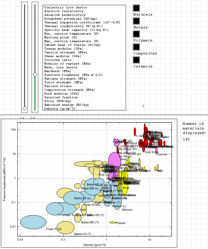 Here is a small program for generation of Ashby-like material property charts. The data has been taken from the online ressources for Buchmayr 2002. Besides the Maxima plugin and it's drawing functions this program also demonstrates the use of varous plugins by Davide (Table, Slider, DataExchange, Checkbutton List)