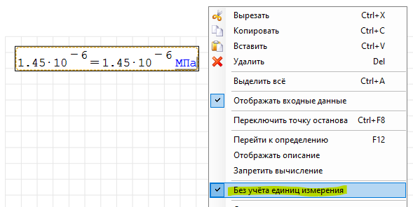 - В контекстном меню этой формулы выбрать "Без учёта единиц измерения", чтобы программа не требовала сопоставления итоговых и желаемых единиц измерения: