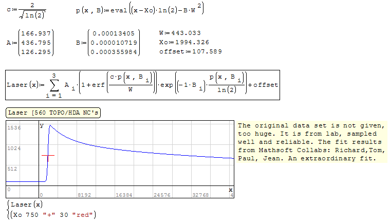 SMath Forum SMath Studio Questions Incomplete Plot 1 Pages (4 items) Incomplete Plot - Incomplete Plot - Messages Go to last post #1 Posted: 4/18/2016 2:12:18 PM Jean Giraud 983 likes in 6,866 posts. Group: User Here, I think the guilty is Smath "erf". I would prefer be the guilty one.Any collab is welcome to 'doctor' that one.JeanScrap Laser.sm (41.31 KiB) downloaded 728 time(s). #2 Posted: 4/18/2016 2:28:13 PM Davide Carpi 1,435 likes in 2,913 posts. Group: Moderator No issues I think,the guilty is 1+erf()*exp() that should be (1+erf())*exp();Let me know if there are other issues (erf is part of StatisticalTools) Scrap Laser.sm (35.36 KiB) downloaded 749 time(s). If you like my plugins please consider to support the program buying a license; for personal contributions to me: paypal.me/dcprojects #3 Posted: 4/18/2016 3:12:50 PM Jean Giraud 983 likes in 6,866 posts. Group: User Thanks Davide,I just doctored it before reading you. Sorry for my distraction.Jean 1 users liked this postDavide Carpi 4/18/2016 8:04:00 PM #4 Posted: 4/18/2016 3:50:25 PM Jean Giraud 983 likes in 6,866 posts. Group: User The "laser fit". Quite involved behind the scene. 1 users liked this postDavide Carpi 4/18/2016 8:04:00 PM 1 Pages (4 items) New Posts No New Posts