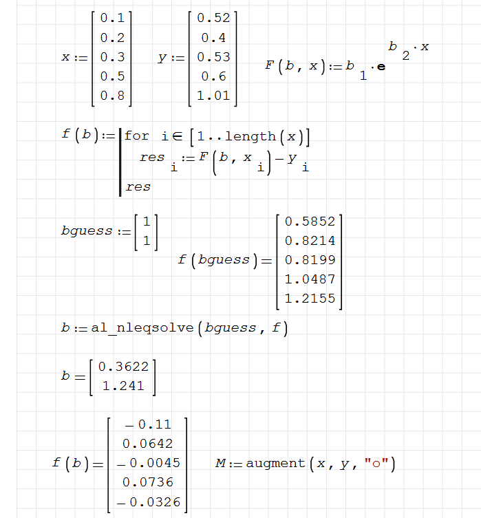 SMath Forum SMath Studio Samples Nonlinear curve fitting - example 1 Pages (2 items) Nonlinear curve fitting - example - using al_nleqsolve - Messages Go to last post #1 Posted: 4/20/2021 3:56:16 AM Radovan Omorjan 325 likes and 1 dislikes in 2,052 posts. Group: Moderator A simple example of curve fitting with al_nleqsolve().I hope someone will find it useful.Regards,Radovan nonlinfit.sm (8.74 KiB) downloaded 855 time(s). When Sisyphus climbed to the top of a hill, they said: "Wrong boulder!" 5 users liked this postFridel Selitsky 4/20/2021 4:31:00 AM, sergio 4/20/2021 5:13:00 AM, NDTM Amarasekera 4/20/2021 5:45:00 AM, Alvaro 4/20/2021 6:01:00 AM, Davide Carpi 4/20/2021 7:14:00 AM #2 Posted: 4/20/2021 11:41:55 AM Jean Giraud 983 likes in 6,866 posts. Group: User Genfit [Algo Minimize(al_nleqsolve Alco, Thurber)].sm (85.48 KiB) downloaded 737 time(s).I just posted this morning, but don't see ? 1 Pages (2 items) New Posts No New Posts