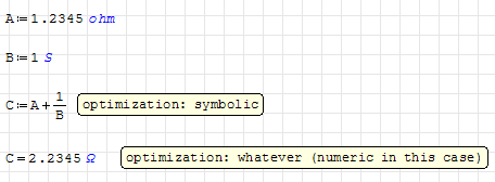 If I try to add a quantity with units Ohms to the reciprocal of a quantity with units Siemens, an error occurs: Units don't match.