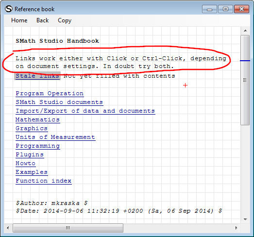 I was expecting that, after such a long time, your Handbook would have worked (regarding to the links and the menu items Home, Back, Copy) like the other Reference book (made by Andrey long time ago). Unfortunately, it is still in the workaround state. As I mentioned many times, your Handbook should be the main Reference SMath book (and a real Help system) at the moment IMHO. Why this is still not the case, I do not know.