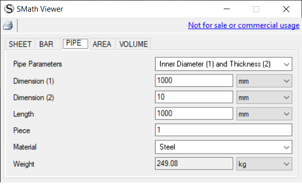 SMath Forum SMath Studio Samples Weight Calculation 1 Pages (3 items) Weight Calculation - Messages Go to last post #1 Posted: 2/18/2019 4:30:04 PM overlord 582 likes in 1,349 posts. Group: Moderator Maybe this little program help someone.Regardsweight.7z (545.74 KiB) downloaded 391 time(s). 3 users liked this postAndrey Ivashov 2/18/2019 4:33:00 PM, Arie 2/18/2019 5:12:00 PM, Davide Carpi 2/18/2019 8:37:00 PM #2 Posted: 2/18/2019 6:45:52 PM fedeghi 25 likes in 112 posts. Group: User Could you post the source .sm file too?:d #3 Posted: 2/19/2019 2:44:11 AM overlord 582 likes in 1,349 posts. Group: Moderator WroteCould you post the source .sm file too?:d ohh haven't I? sorry, here it is... weight.sm (30.6 KiB) downloaded 732 time(s). 1 users liked this postAndrey Ivashov 4/3/2019 3:28:00 AM 1 Pages (3 items) New Posts No New Posts