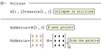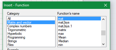- use the function dialog (press CTRL+E or choose the Insert > Function menu item or click on the fx symbol from the toolbar) choose the Matrix and vector group and search mat (click on whatever item and press m), then double click it or click on the insert button