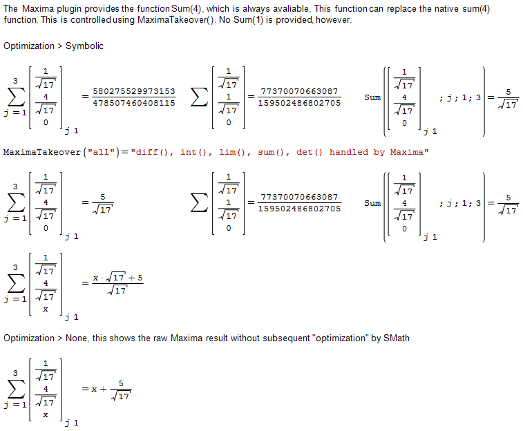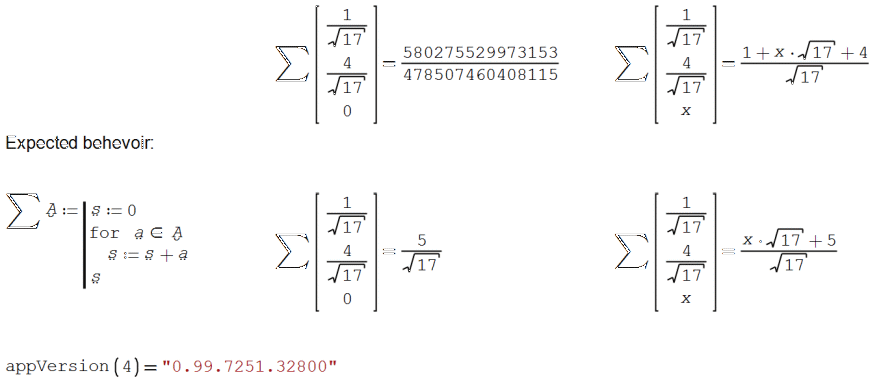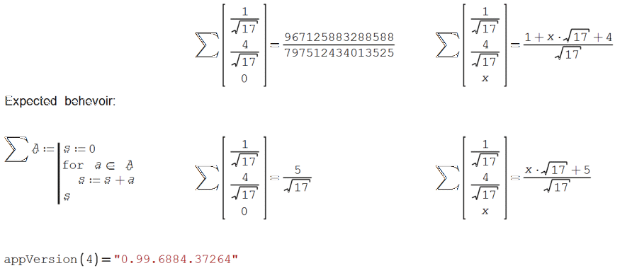 Hi. Thanks Overlord. I don't see these other problem. What make troubles for me is the fact that sum don't returns the symbolic values but numerical approximations, in this case for sqrt(17). I expect to see sum(vec) = 5/sqrt(17) instead the rational showed. I introduce the "x" value just for check if sum have some eval() function somewhere. But then ... ups, another issue simplifying 1+4.