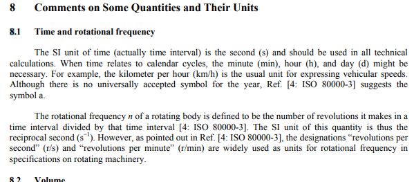 Quantities called “frequency”, “angular frequency”, and “angular velocity” always be given explicit units of Hz or rad/s and not s−1. (Page 26)