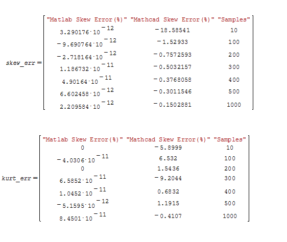 Lastly, I performed a small experiment by creating a Matlab based skewness and kurtosis function as well as a mathcad based skewness and kurtosis function. I then created random vectors with increasing sample sizes (from 10 to 1000) and compared the % error from the built in Smath Skewness and Kurtosis functions. As you can see the as the sample size increases the difference between the Matlab and Mathcad algorithms decreases (at least for Skewness). It may take a minute or two to run.