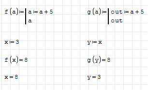 Yes, this is by design. This feature called Output Arguments and it can be used within procedures (functions defined with line(..) at right). This allows to return any number of values from the function. One just should remember that changing value for the variable of the same name as defined in function's arguments for such functions will also override global value of that variable.