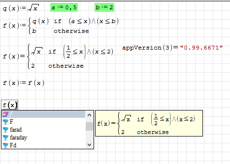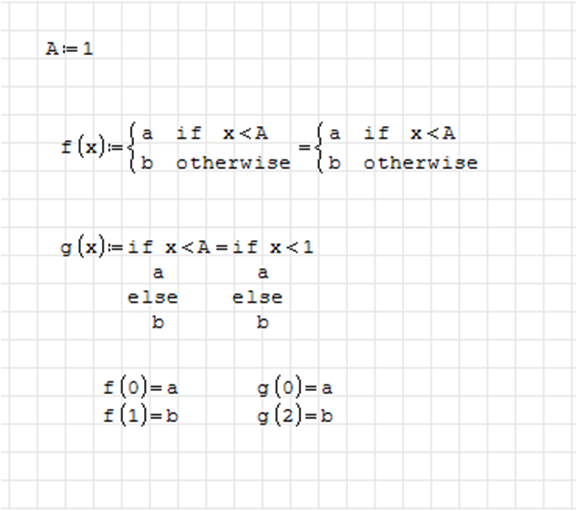 When f(x) is defined it sets f(x) equal to cases(a,xNote when g(x) is defined it will step through and evaluate the if() function and each individual input parameter (xThe cases() function within f(x) doesn't actually evaluate until it is called with f(0).
