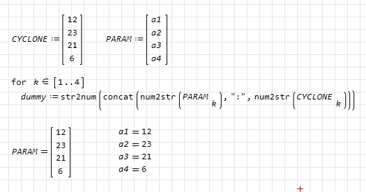 la pregunta: Es posible realizar una declaración / asignación de variables mediante vectores. Es decir tener un vector columna(CYCLONE) que contengan las variables (a1, a2, a3, a4) y en otro vector columna(PARAM) los valores a asignar (12, 23, 21, 6), tal que cuando se consulte el valor de a1=12; a2=23; a3=21; a4=6.