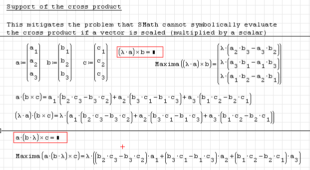 SMath fails to compute the cross product of two vectors, if one of them (or possibly both) is a product with a symbolic constant and a vector (a scaled vector).
