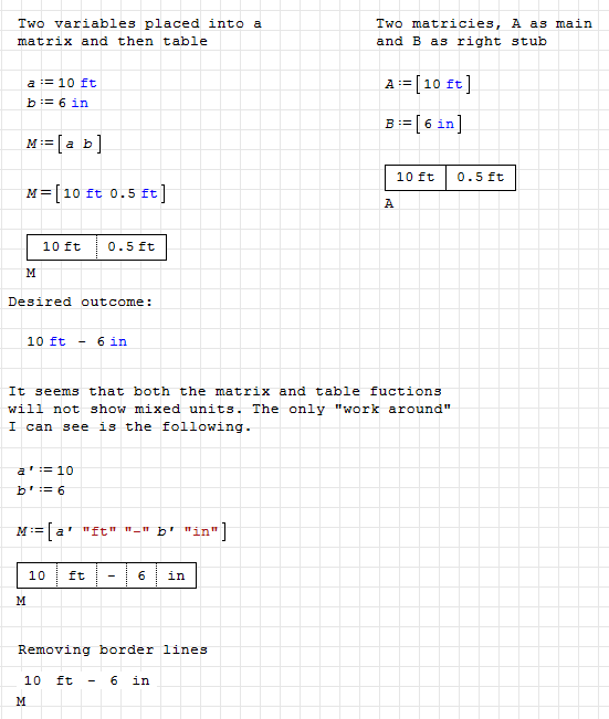 Why you may ask? This is an attempt at showing mixed units as a single output result in sheet. Often lengths are specified in feet + fractional inches.