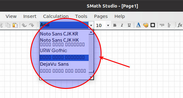 Waluyo, I have the same issue as you on the garbled/unordered font list. It's not ideal, but SMath usability in linux has improved so drastically for me in the span of a week that I can't feel too bad about it. Glad Overlord's suggestion fixed you up.
