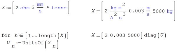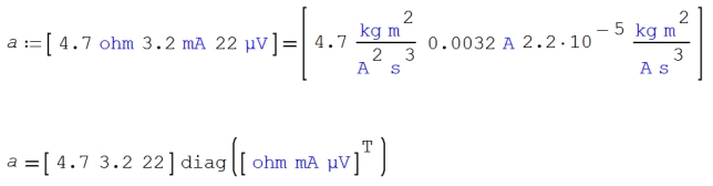 Units are not simplified (i.e. to ohms etc) from the base SI units, when they are in matrices. This means that I can't really use a vector to return tuples from a function or display numbers with mixed units, as the units become unrecognisable.