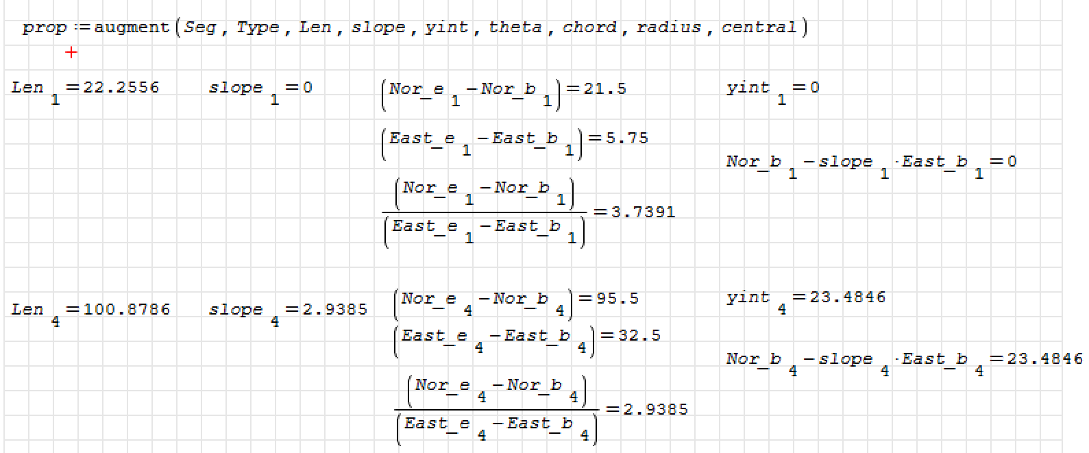 The slope (m = dy / dx) of the first two segments are being output as Zero, but the values (based on the input coordinates) should both be c. 3.7.
