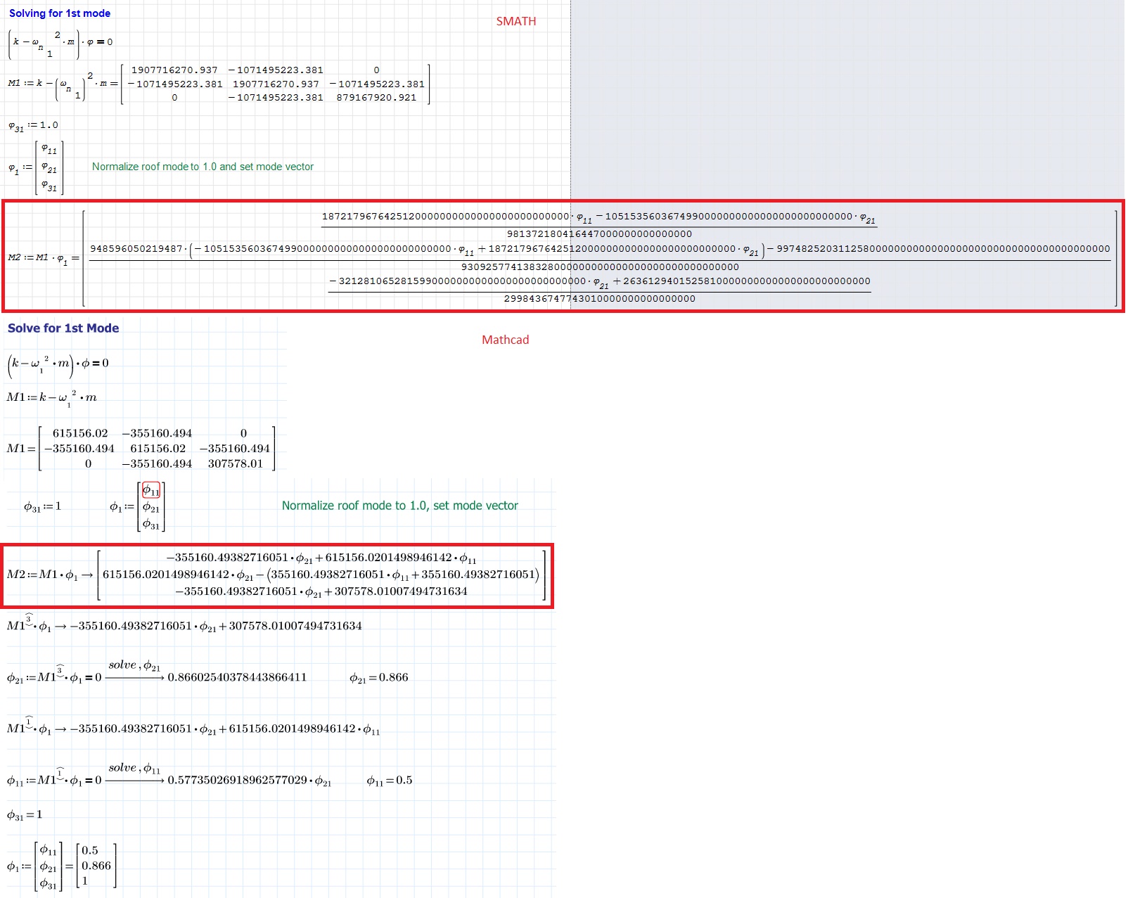 Please see the screenshot below with a comparison between SMath and Mathcad. Mathcad produces the expected output of multiplying a matrix by a vector of variables - a matrix with those variables in the appropriate terms of the matrix. SMath, for all the years I've used it, has never done this well. Setting optimization to symbolic comes close in that the result has the variable placed in each term of the matrix, but symbolic has always been completely useless for me because it always makes everything into these huge weird fractions. Can nothing be done about this?? Surely I am not the only one who finds this frustrating and difficult to work around? Does anyone have any suggestions?
