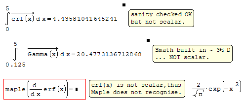 SMath Forum SMath Studio Bugs & Problems Gamma(x), erf(x) 1 Pages (1 items) Gamma(x), erf(x) - Gamma(x), erf(x) - Messages Go to last post #1 Posted: 1/8/2018 1:30:49 AM Jean Giraud 983 likes in 6,866 posts. Group: User These two aren't scalar wrt x. Inadequate code from sourceHow many more of these very basic maths functions ?Gamma(x) is too low accuracy. The 15 D was published for designers to doctor.If you can't find, will be please to attach again.Jean 1 Pages (1 items) New Posts No New Posts