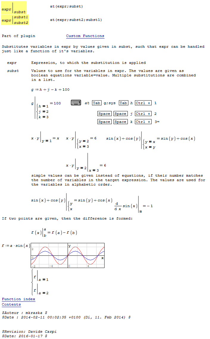 WroteHi Amarasekera, a pleasure to greet you. I'm sure others in this forum will be able to give very good examples, I would just like to add that the 'at' function is more or less similar to the 'eval' in maple, although it also has a 'subs' function, and even another one like 'algsubs', or Mathematica's [b]f /. x -
