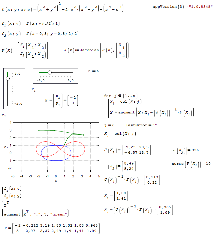 Если уравнений не два, а три, то матрица Якоби будет состоять из трёх строк и трёх столбцов. При этом графически отображать решение придётся не двумя кривыми, а тремя поверхностями на 3D-графике, причём их взаимное пересечение и будет отмечать решение (задание читателю).