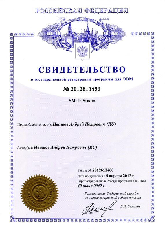 SMath Forum Общение О проекте Официальные документы 1 Pages (1 items) Официальные документы - Messages Go to last post #1 Posted: 6/28/2012 3:01:15 PM Andrey Ivashov 2,315 likes in 3,933 posts. Group: Super Administrator Получено свидетельство о государственной регистрации программы для ЭВМ SMath Studio. 12 users liked this postDavide Carpi 6/28/2012 5:20:00 PM, Radovan Omorjan 6/29/2012 4:14:00 AM, уни 6/29/2012 8:12:00 AM, Mikka 6/29/2012 10:18:00 AM, Медведев Виктор 6/29/2012 11:24:00 AM, Valey 6/30/2012 2:33:00 AM, Serg 7/16/2012 1:23:00 PM, tca 8/7/2012 2:32:00 PM, Rubidy 11/29/2012 3:17:00 PM, XroM 4/9/2013 12:25:00 PM, Сергей 6/17/2013 6:43:00 AM, VoXter 11/8/2014 4:41:00 PM 1 Pages (1 items) New Posts No New Posts