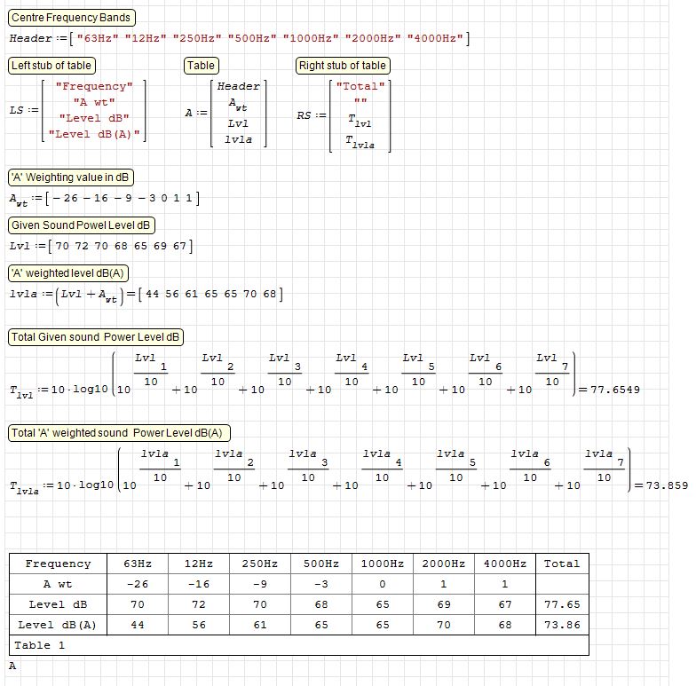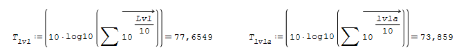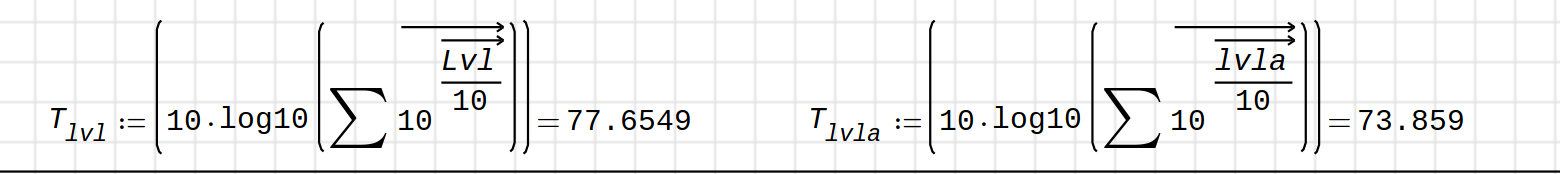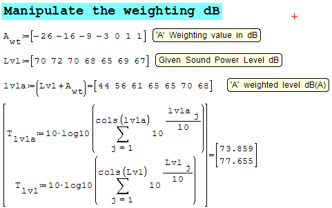 I am trying to work out the 'A' weighting values for sound levels, I have the calculation working, but I would like to simplify the total power levels, by either summation or a loop function. I know how to use summation, but cant get it to work on this.