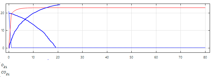 In general, there is something that doesn't work properly, because the chart describes the depleting and the increment almost linear until the O2 don't reach 0. After that point the CO2 increment start to being described in a "realistic way