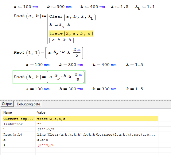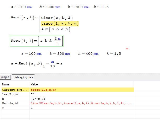 Almost all programming languages include debugging procedures. SMath, owing a high transparence and friendly design process, is naturally less indebted to an eventual debugging process. A special case is inside functions.