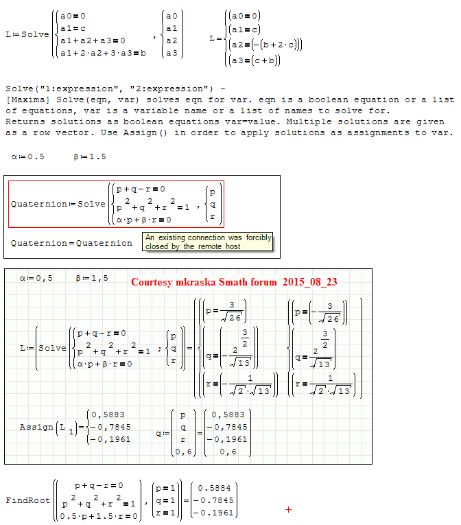 WroteSorry. with maple it works. Smath doesn't load the Maxima Plug-In on my Windows10 system when I use Solve(). If i assign Smath the Maxima.bat i get an error report.
