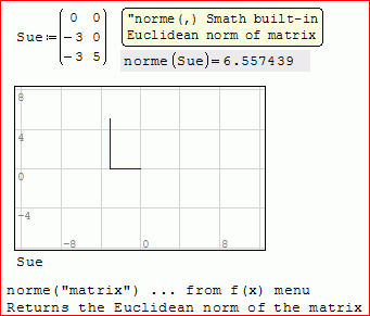 The length of a vector can be computated with the euclidean norm (wikipedia); do it for each vector you have, sum the results and you have the total displacement.WroteHow would I plot those two vectors in SMath? How would I then draw a diagonal line connecting the ends of those two vectors in order to calculate Sue's displacement from her starting point?
