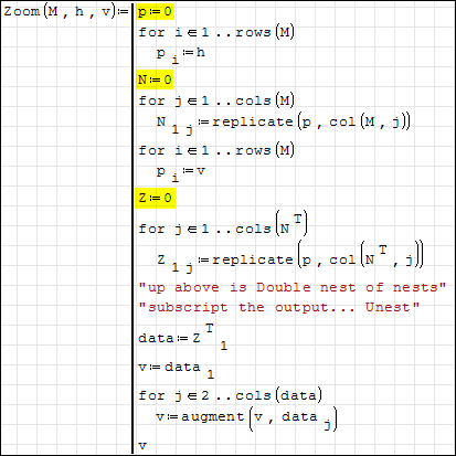 The error message of SS 5346 is strange, however in 0.98 is "Requested matrix element doesn't exist"; following the latest message the error is that in the function Zoom(M, h, v) you are using local unknowns as target of the assignments inside the loops; since you are in a programming-function, and p,N,Z are not defined before the loops, if in the canvas exists a variable with the same name, this variable is used in the function and the values locally replaced (or added if the target element is outside the original sizes). In your case the issue is triggered by Z (defined in the canvas in "Zoom integer").