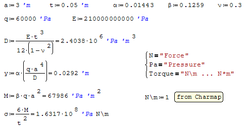 PompelmoTell is right, it should be 1-ν^2 instead of 1-ν^3, I made a mistake while rewriting this. I also thought that q should be in N/m^2 instead of N/m but in such case M would have incorrect units: M=β*q*a^2=(N/m^2)*(m^2)=N while it should be in N*m. On the other hand, with q in Pa the units of σ and y are correct, only M is wrong.