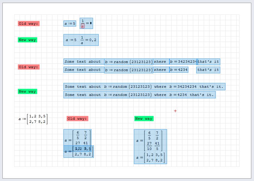 Later, when Andrey added some features and with the text region utilities by Davide, the situation improved a lot. I won't repeat the feature requests here, they are stored in the bug tracking system. I probably will resume maintenance of the interactive book, if there is a better and obvious access to it from within SMath Studio and a working navigation infrastructure is available. At least, the new embedded region feature will help to make better documentation.