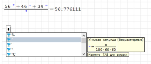 Всем привет. Столкнулся я с такой проблемой, что при расчетах необходимо переменной присваивать значения географических координат, причем не только в градусах, а с точностью до секунд, т.е. в формате 56 град 46 минут 34 секунды, но никак не могу найти можно ли это реализовать в Smath. С записью просто градусов никаких проблем нету. Может кто подскажет как это корректно сделать?