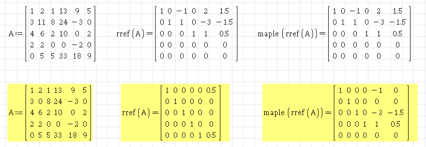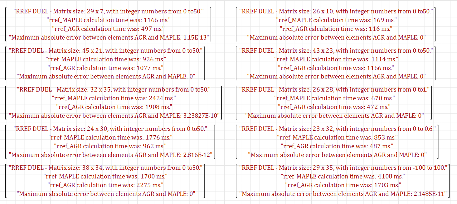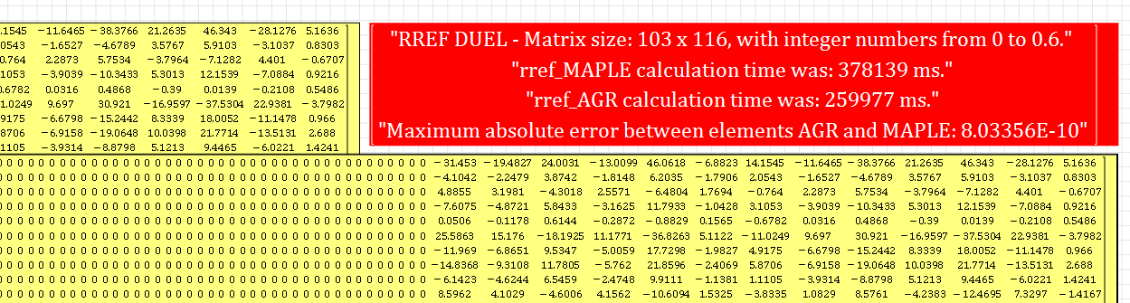 There is an interesting factor that rref_AGR is computed a few milliseconds faster than rref_MAPLE in most cases (in small matrices)