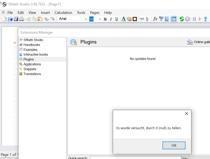 When switching to the online gallery in the extension manager, a division by 0 error appears and the program may freeze. The student lost his edits, because there was no way to get out of this except killing SMath via program manager. In an empty SMath instance, the error is recoverable, i.e. you can close the dialog and exit the extension manager.