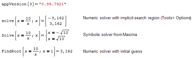 Форум SMath SMath Studio Questions excel solver 1 страниц (3 вхождений) excel solver - Сообщения К последнему сообщению #1 Опубликовано: 16.08.2022 16:43:19 patrick 0 сообщений из 2 понравились пользователям. Группа: User Good evening,How could i use the excel solver function please?Want to solve for x in e.g. x = 10 / xThanksPatrick #2 Опубликовано: 17.08.2022 02:41:30 patrick 0 сообщений из 2 понравились пользователям. Группа: User Thanks! #3 Опубликовано: 17.08.2022 03:50:09 Martin Kraska 1 312 сообщений из 2 228 понравились пользователям. Группа: Moderator Here are some alternative facts.Blatt5.sm (5,35 КиБ) скачан 713 раз(а). Martin KraskaPre-configured portable distribution of SMath Studio: https://en.smath.info/wiki/SMath%20with%20Plugins.ashx 1 страниц (3 вхождений) Новые сообщения Нет новых сообщений