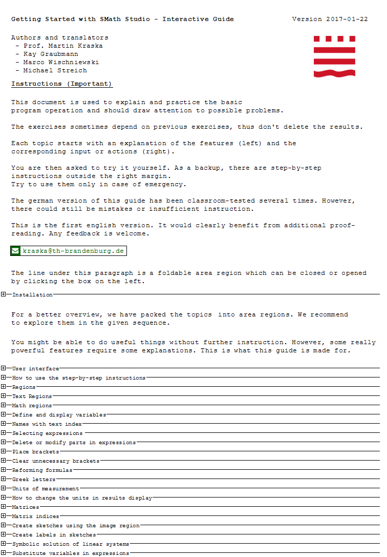 I uploaded an interactive (german) tutorial "Erste Schritte mit SMath Studio" to my support page. It is a single .sm file with 22 area regions (topics).